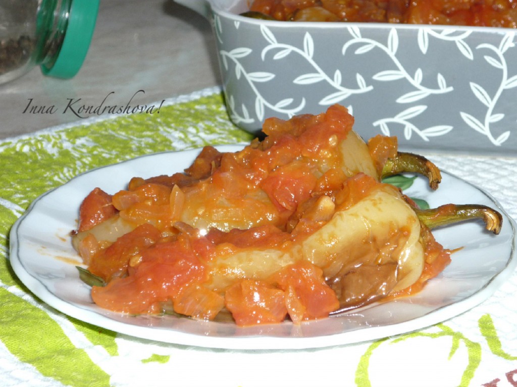 Помидоры, тушеные с луком, выложить на жареный перец и разровнять.