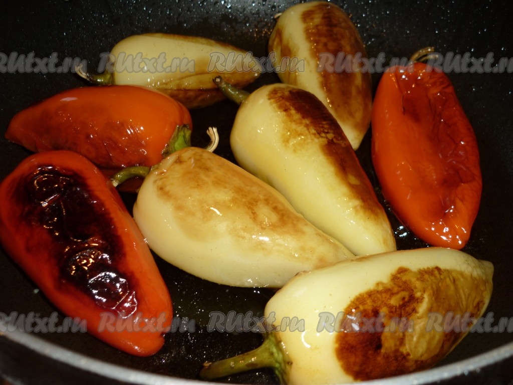 При обжаривании из перца выделяется сок и, попадая в масло, очень сильно брызгает, поэтому нужно открывать крышку очень аккуратно, когда будете переворачивать перцы на другую сторону. Обжаренные перцы сложить на тарелку или в подходящую посуду. Я кожицу с перца не снимала, но, по желанию, можно снять. Для того чтобы легче было снять кожицу, обжаренные перцы нужно поместить в ёмкость, накрыть крышкой, дать немного остыть, затем очистить от плёнки, покрывающей их сверху. Перцы, жареные целиком на сковороде, особенно вкусно подать с помидорами, тушеными с луком.