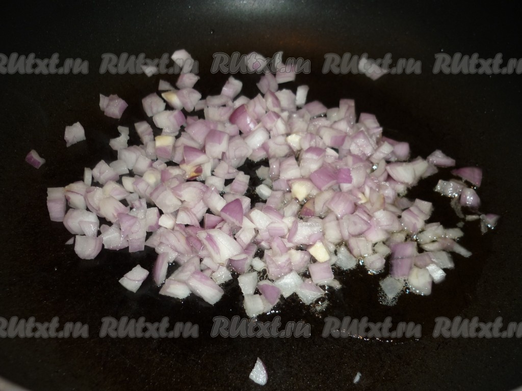 Лук очистить и нарезать кубиками. Обжарить лук на растительном масле в течение 3-4 минут, периодически помешивая.