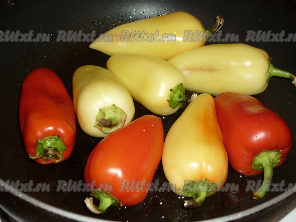 Болгарские перцы вымыть под холодной проточной водой, обсушить бумажным полотенцем. Сковороду с растительным маслом разогреть и выложить перцы целиком. Масло должно покрывать дно сковороды полностью. Сковороду накрыть крышкой и обжарить перцы по 3-4 минуты с каждой стороны на среднем огне.