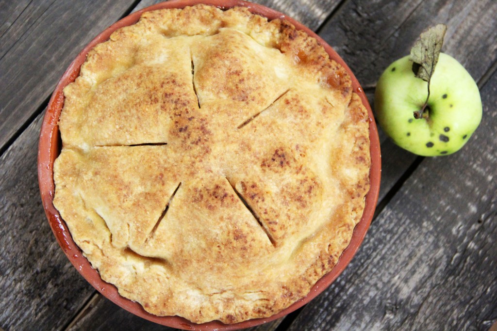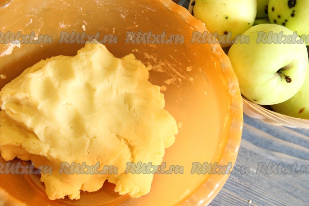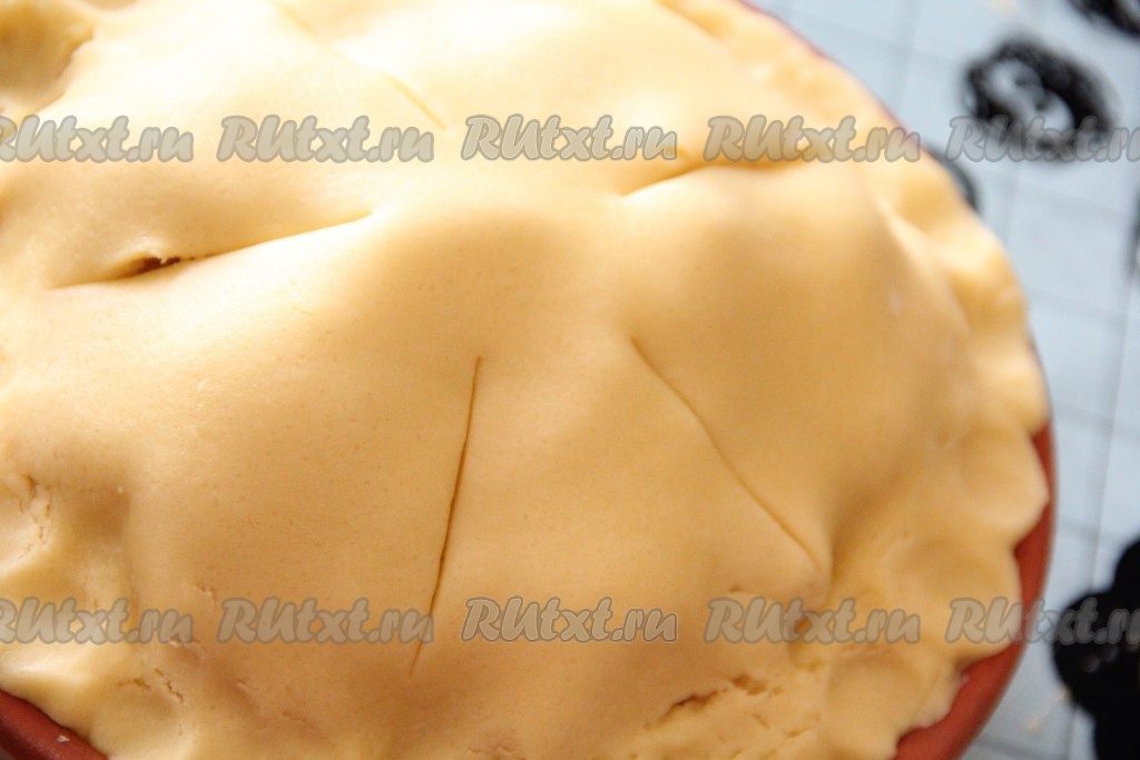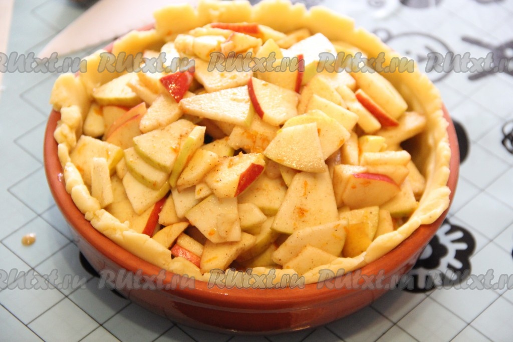 Вторую часть теста раскатать в круг и выложить поверх яблочной начинки. Хорошо скрепить края теста.