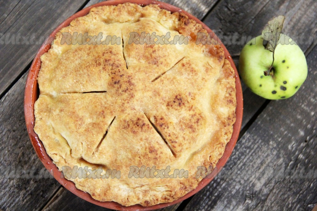Поставить закрытый яблочный пирог в разогретую духовку и выпекать при температуре 180 градусов минут 50. Песочное тесто должно покрыться красивой золотистой корочкой.