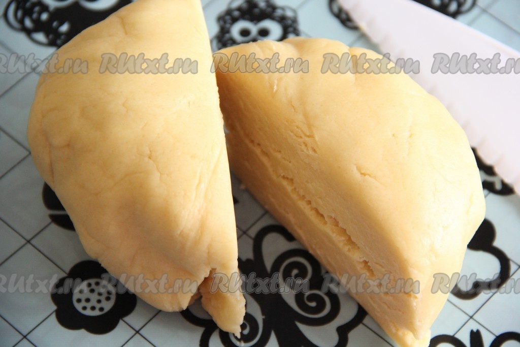 Готовое песочное тесто достать из пищевой плёнки и разделить на две части.
