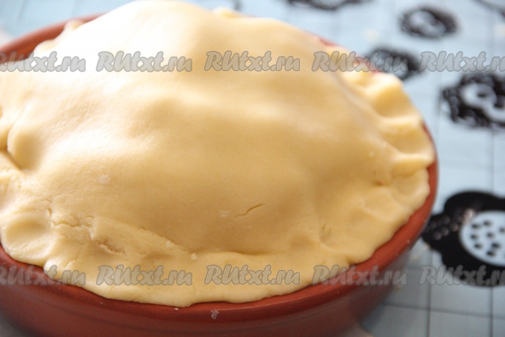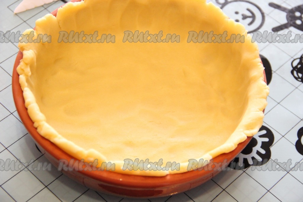 Форму для выпечки (я выпекала пирог в глиняной форме диаметром 18 сантиметров) смазать растительным маслом. Затем выложить тесто в форму так, чтобы края были выше края формы.