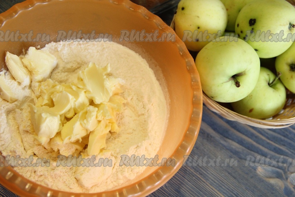 Холодное сливочное масло натереть на крупной тёрке (или нарубить на кусочки) и добавить в мучную смесь.