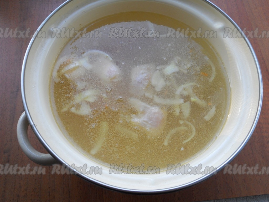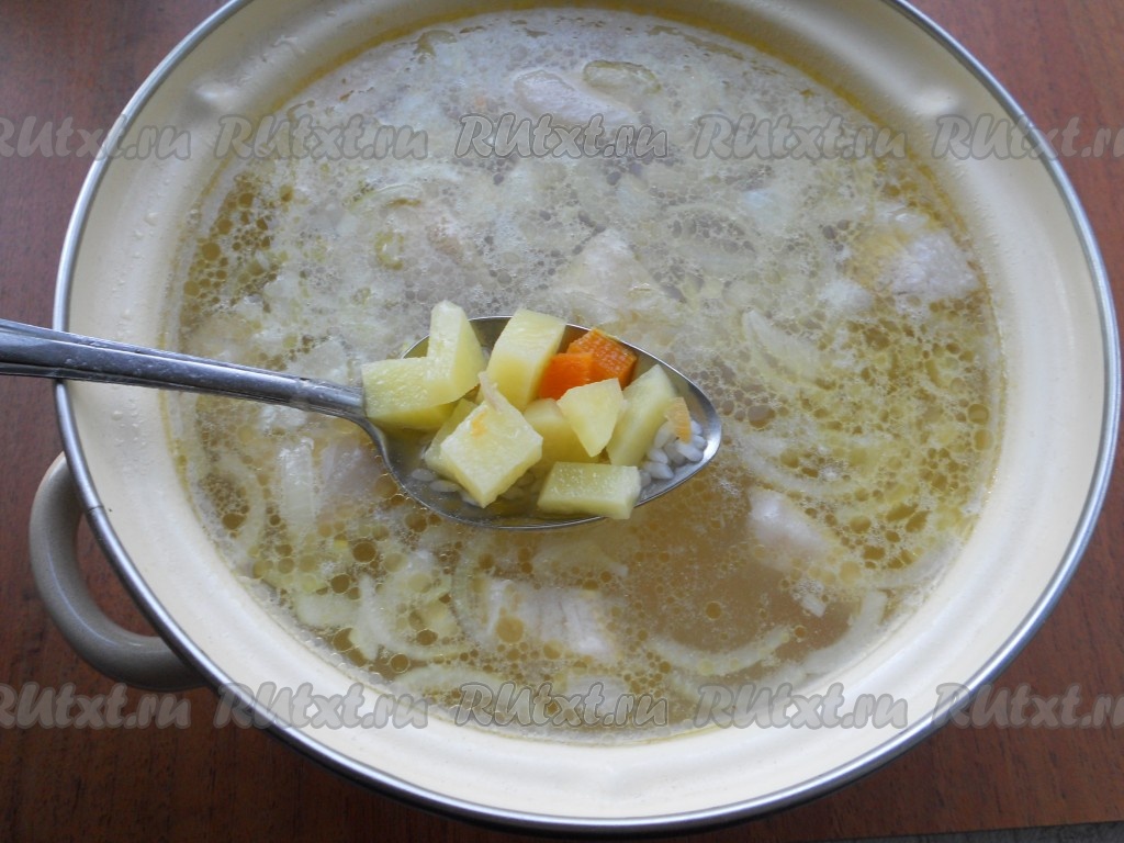 По истечении 15 минут в кастрюлю с мясом добавить картофель и рис, перемешать. Варить суп еще 20 минут.