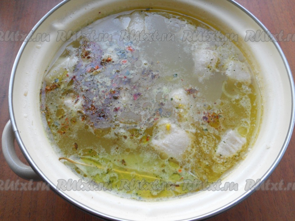 Далее добавить в суп специи, приправу, лавровый лист, измельченный чеснок и варить на слабом огне 10 минут.