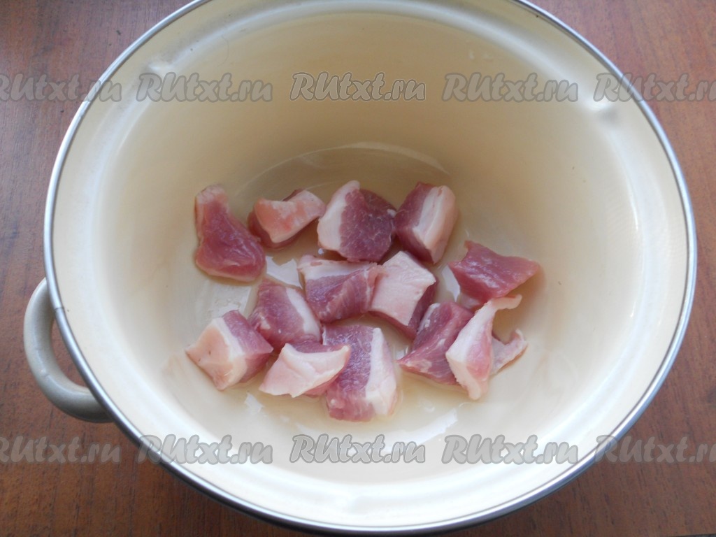 Свинину нарезать средними кусочками, поместить в толстостенную кастрюлю, влить растительное масло.