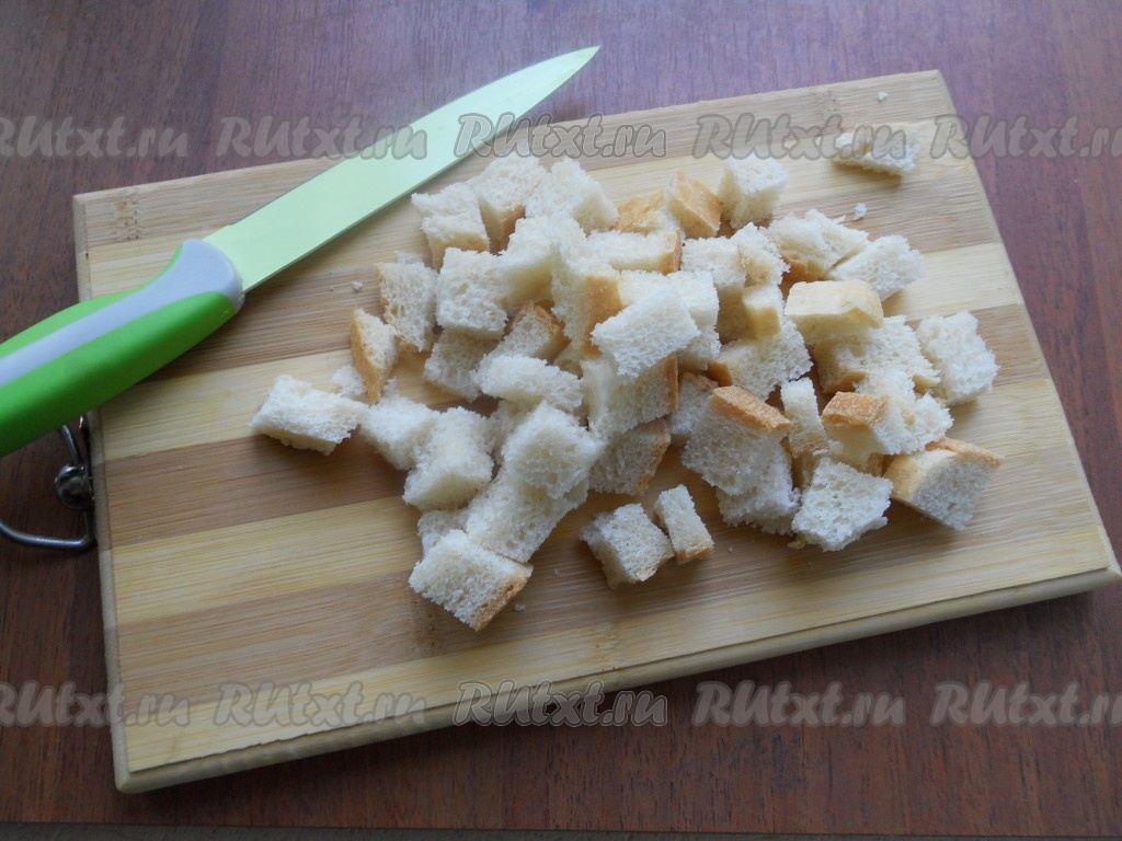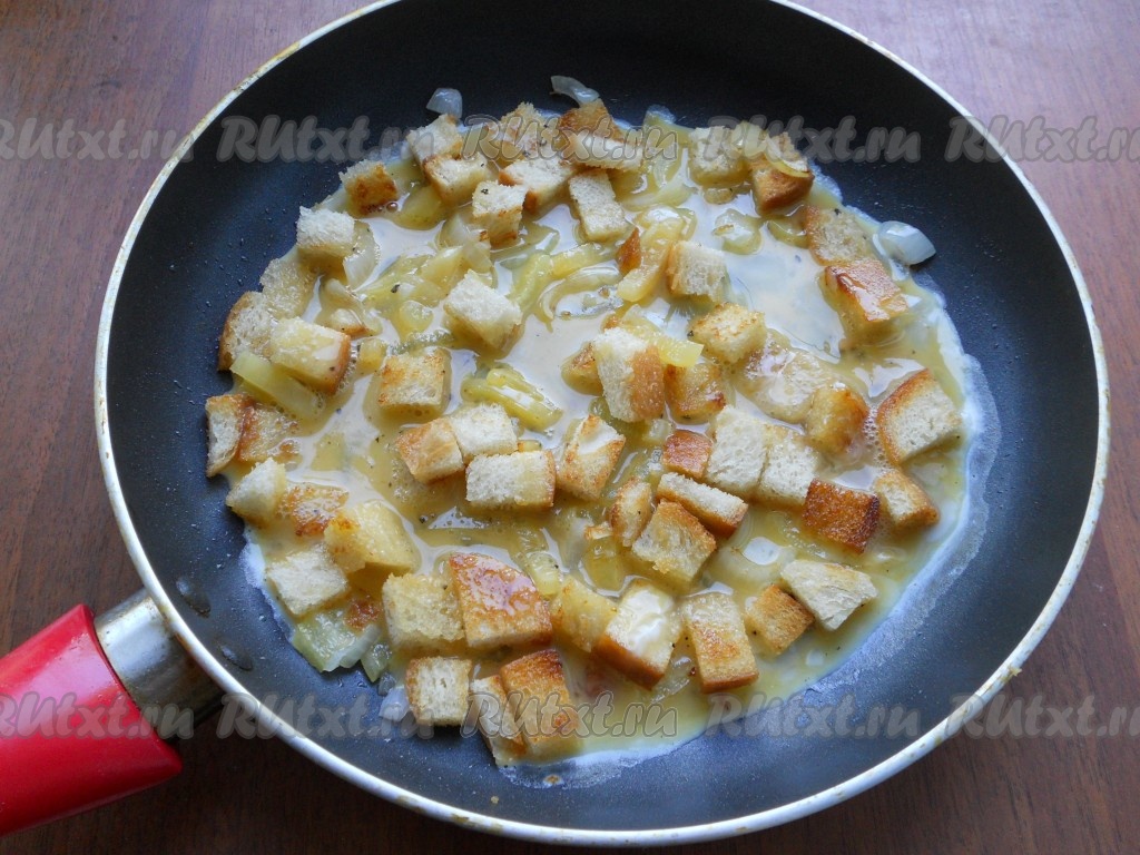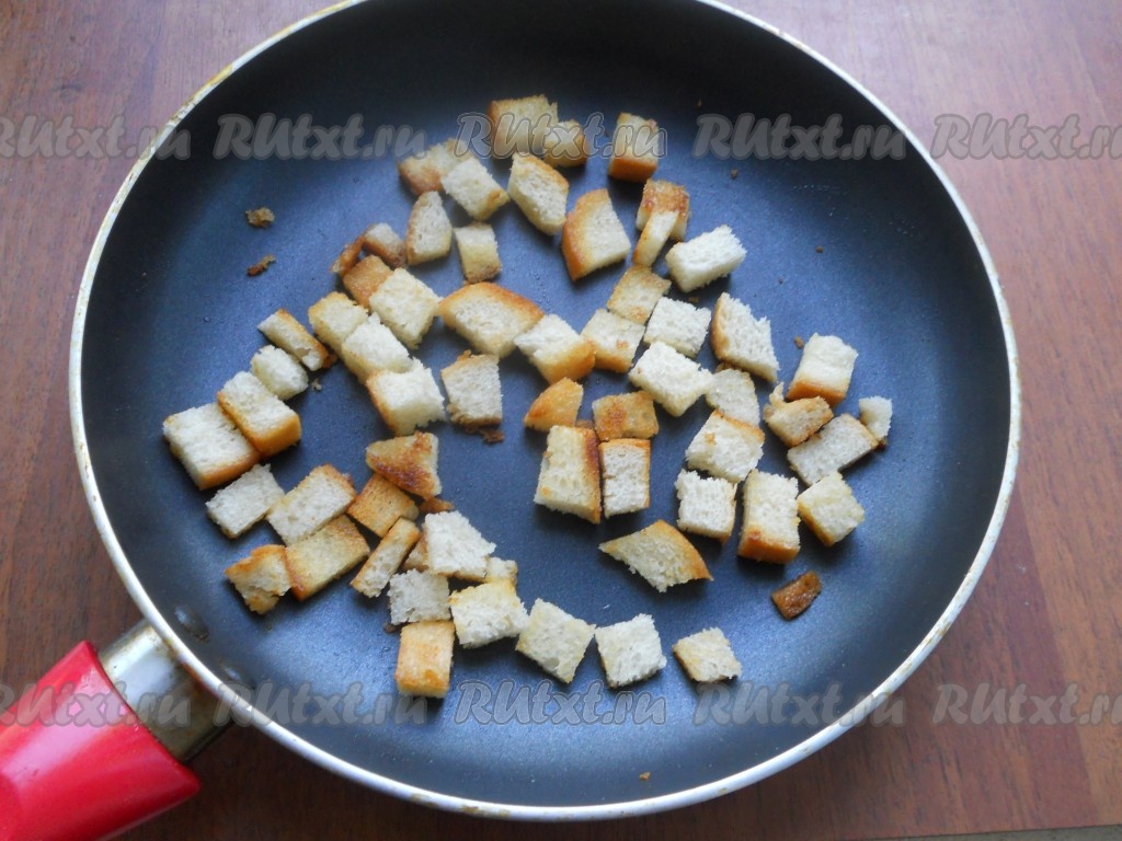 Кубики хлеба поместить в сковороду, влить 1-2 чайных ложки растительного масла и обжарить, перемешивая, на небольшом огне до румяного цвета. Сухарики переложить со сковороды на тарелку.