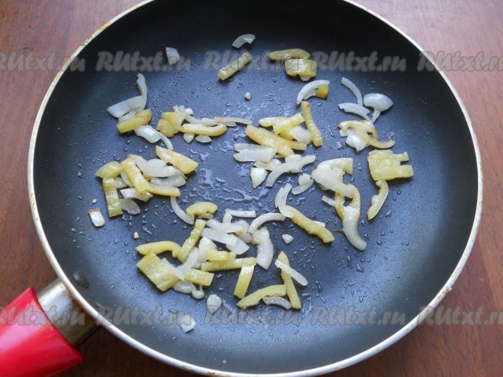 В сковороду влить оставшееся растительное масло, добавить лук и сладкий перец. Обжарить овощи на небольшом огне до мягкости, иногда помешивая.