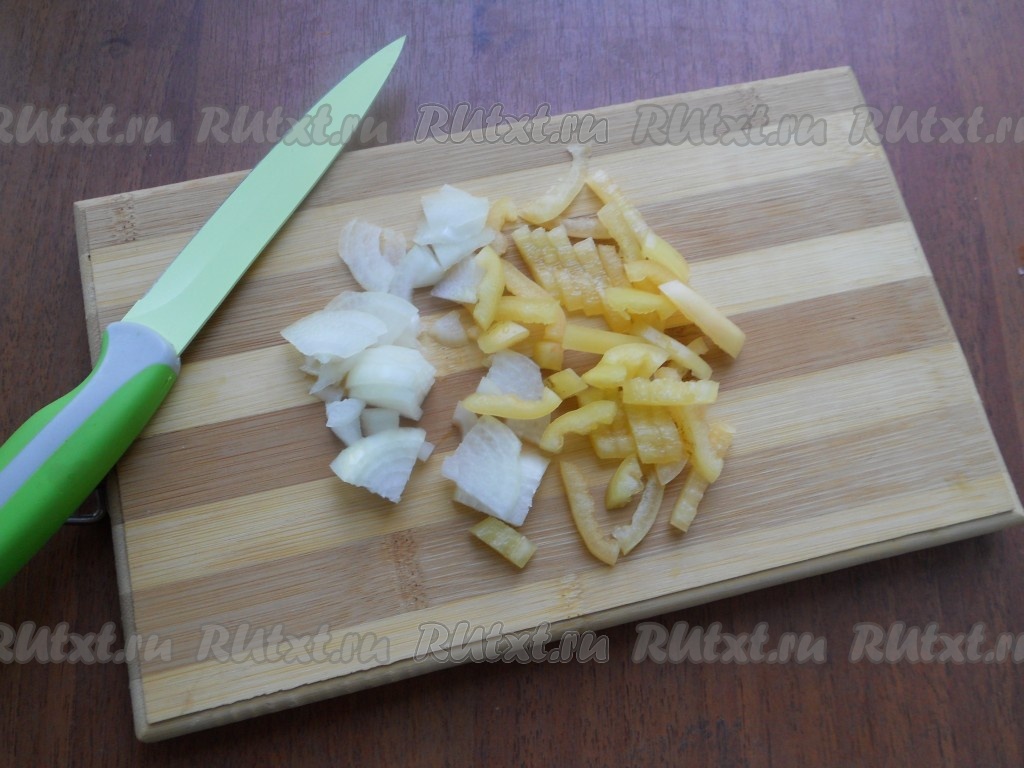 Лук нарезать тонкими небольшими кусочками, перец сладкий - соломкой.