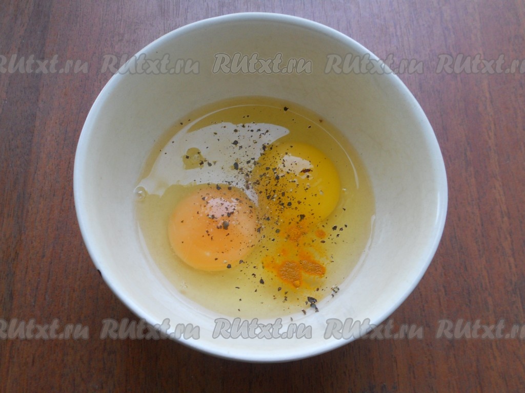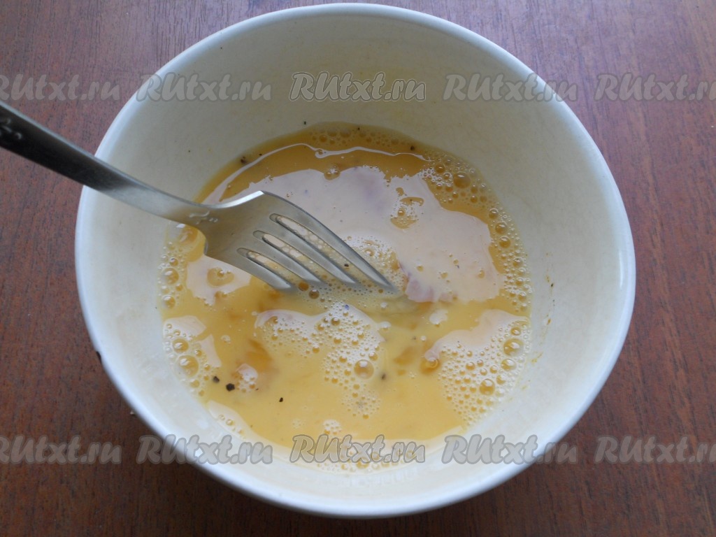 В сковороду к готовым овощам добавить обжаренный хлеб и залить все это яйцами.