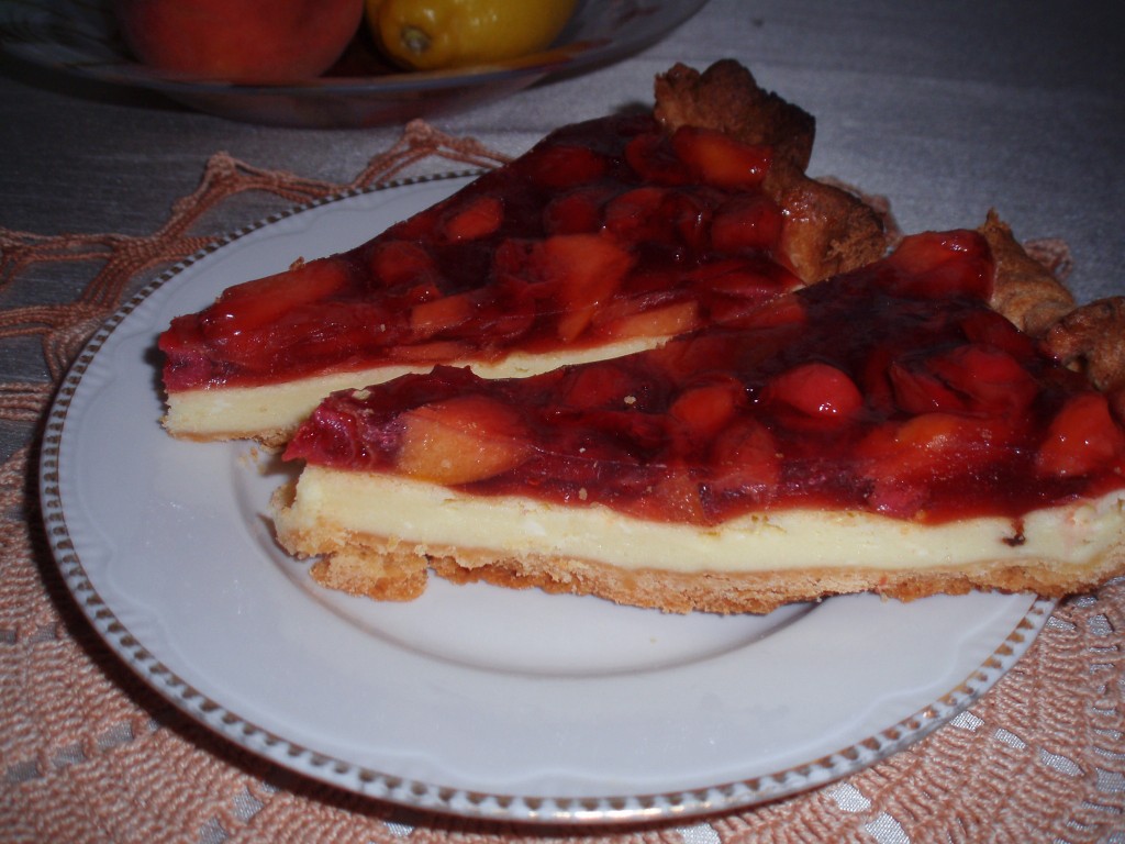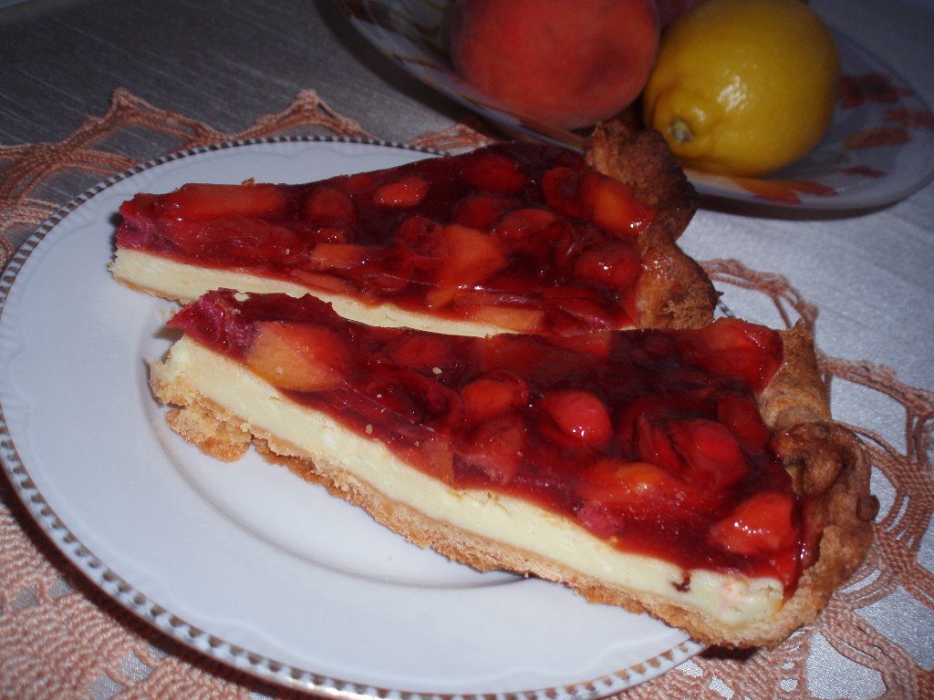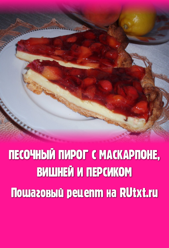 Замечательный пирог! Хрустящее рассыпчатое песочное тесто, нежный запеченный крем из маскарпоне и сочные кисленькие фрукты в желе… Я использовала для начинки замороженную вишню, ее было маловато, поэтому добавила еще и персик. Итак, готовим потрясающе вкусный песочный пирог с маскарпоне, вишней и персиками.