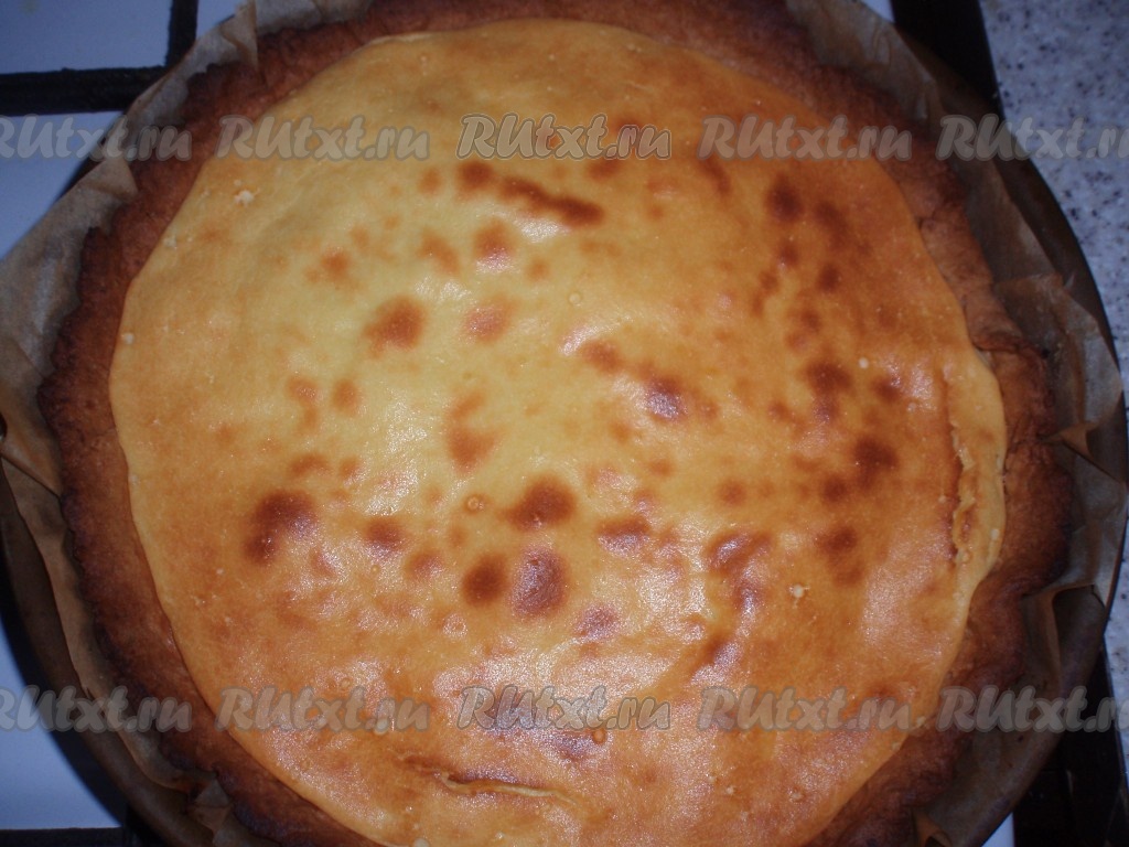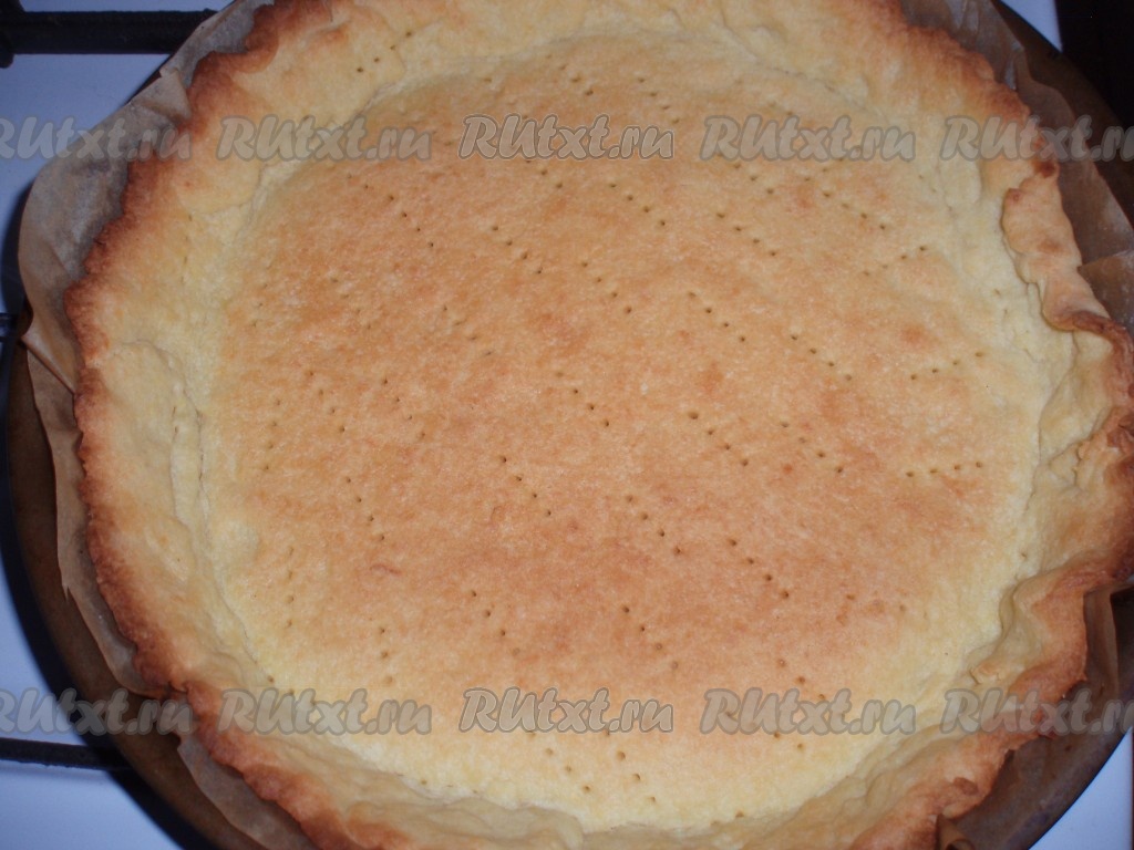Запечь в разогретой духовке при температуре 200 градусов около 10 минут. Тесто должно подрумяниться. Вынуть основу пирога из духовки.
