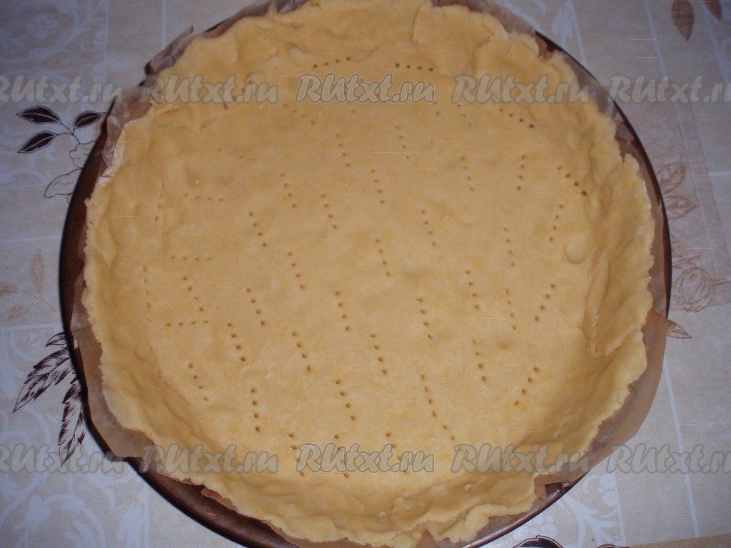 Охлажденное тесто раскатать, выложить в форму для выпечки с невысокими бортиками. Наколоть тесто вилкой.