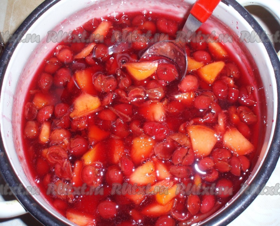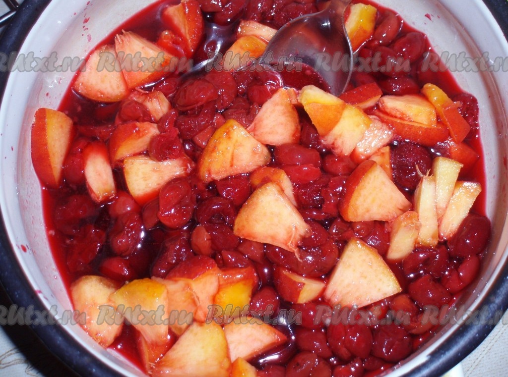 Пока печется пирог, приготовить фруктово-ягодную заливку. Вишню освободить от косточек, персик нарезать на кусочки, добавить сахар и все довести до кипения.