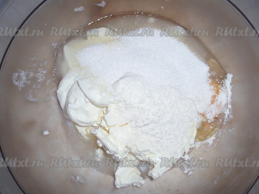Тем временем приготовить крем, для этого смешать до однородности сыр маскарпоне, йогурт, яйца, сахар, ванильный сахар и муку.