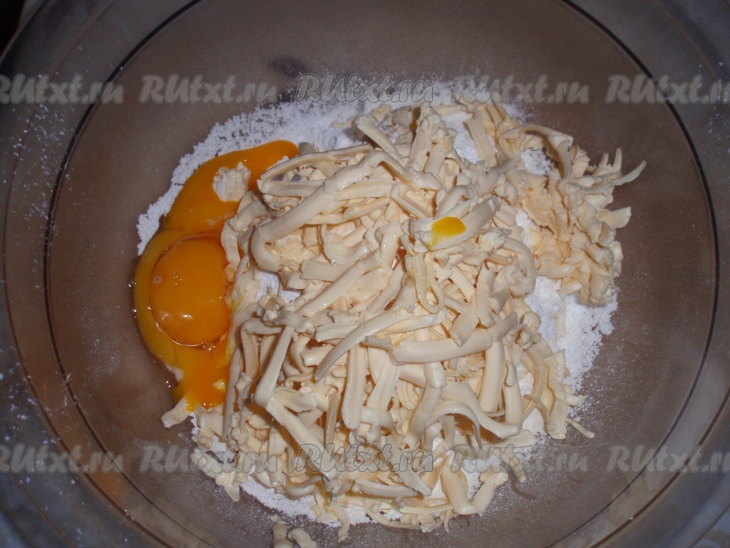 Для приготовления теста муку просеять с сахарной пудрой. Добавить яичные желтки и натертый на терке маргарин.