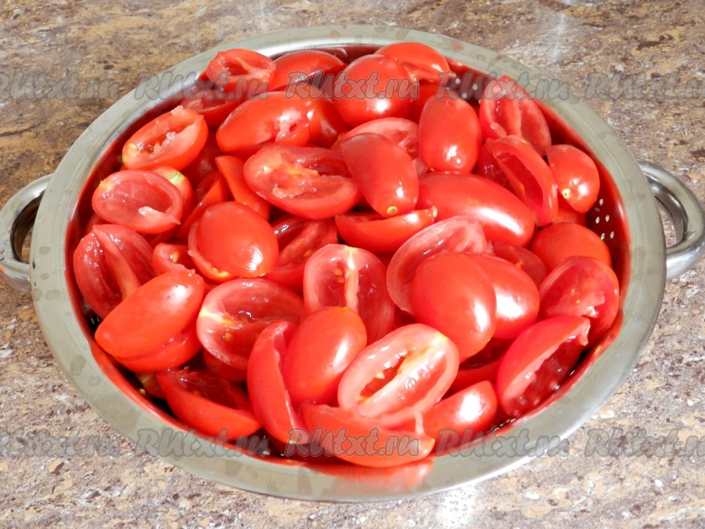 Складывать помидоры в дуршлаг, чтобы стек сок.