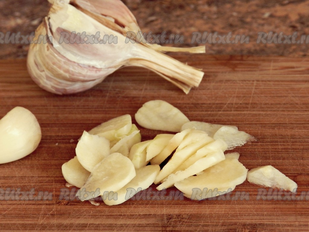 Чеснок очистить и нарезать пластинками.