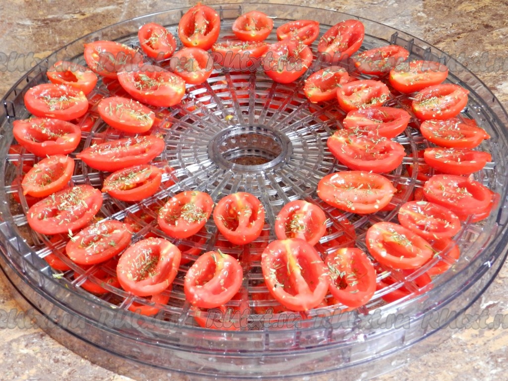 Затем разложить помидоры в сушилке, присыпать солью и специями. Заполнить таким образом все ярусы сушилки.