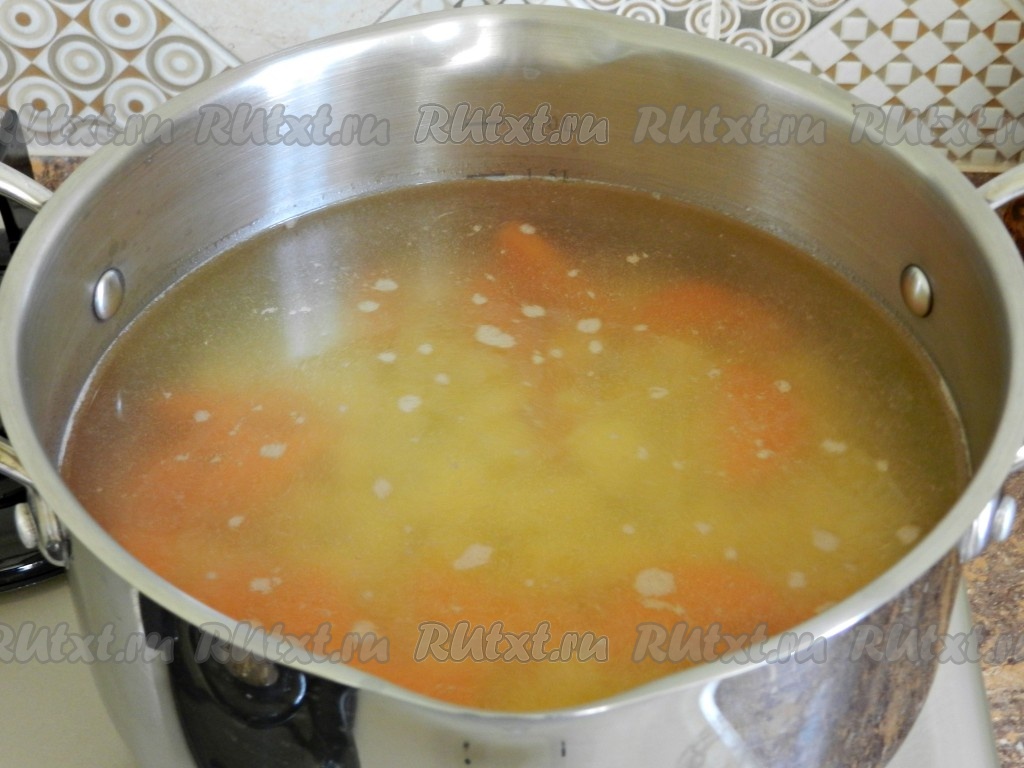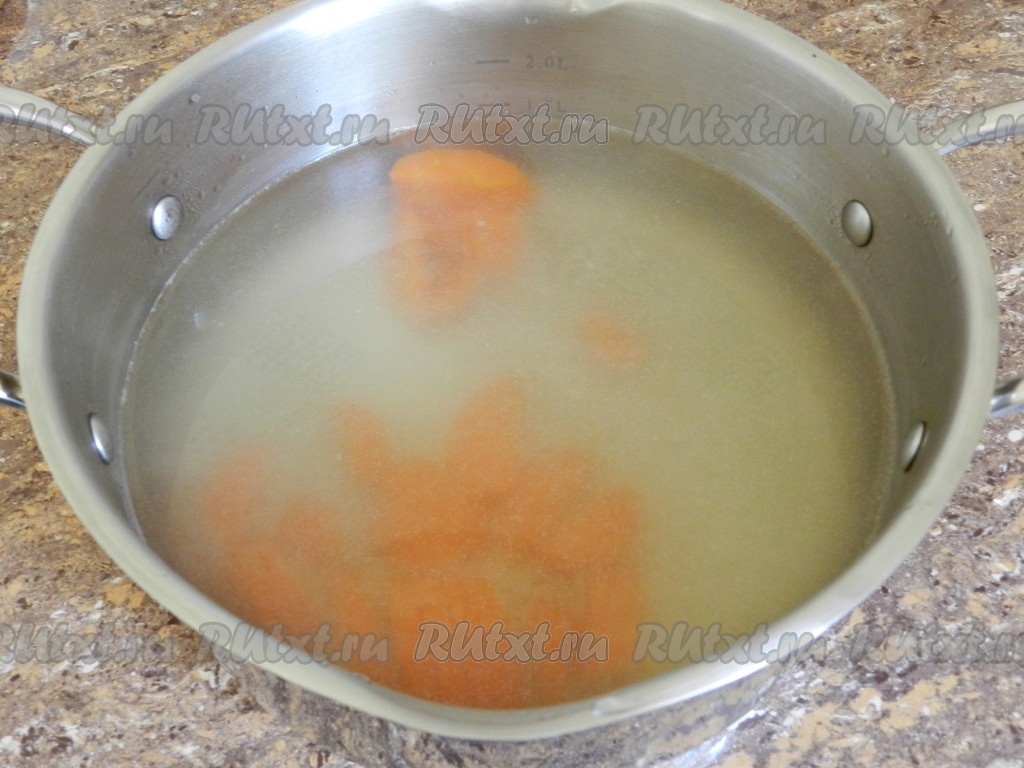 Бульон процедить. Морковь нарезать и вернуть в кастрюлю.