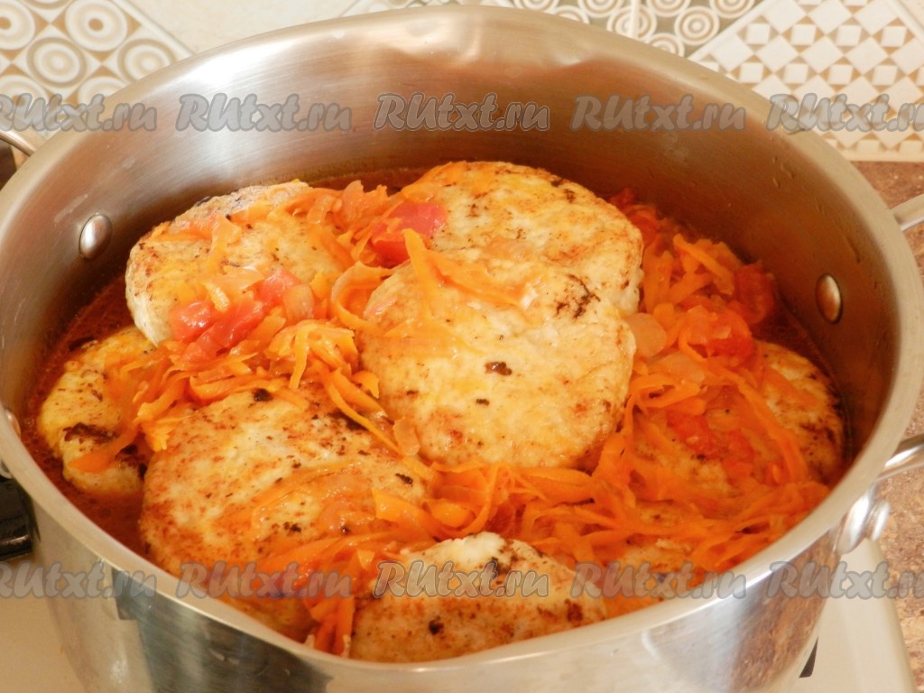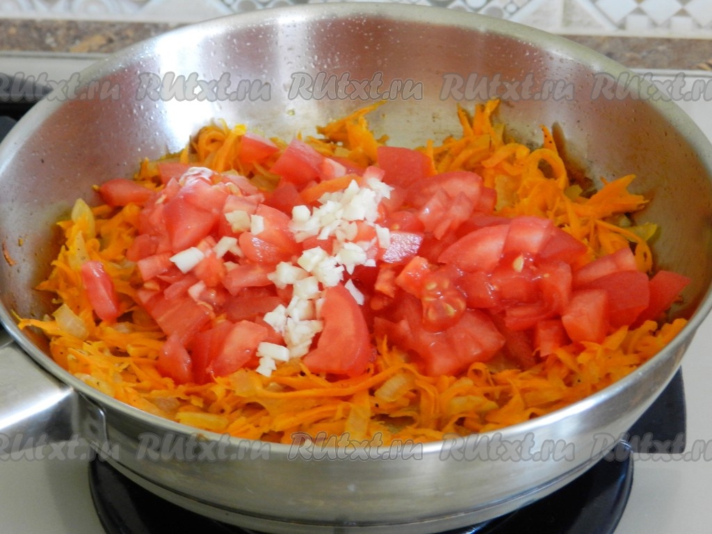Для заправки обжарить на растительном масле вторую половину луковицы и морковь до мягкости, иногда помешивая. Затем добавить помидор без кожи, нарезанный кубиками, и рубленный зубчик чеснока. Посолить, поперчить, добавить любимые специи (я добавила 1 столовую ложку молотой сладкой паприки). Влить немного воды (только чтоб не подгорало) и потушить минут 5 под крышкой.