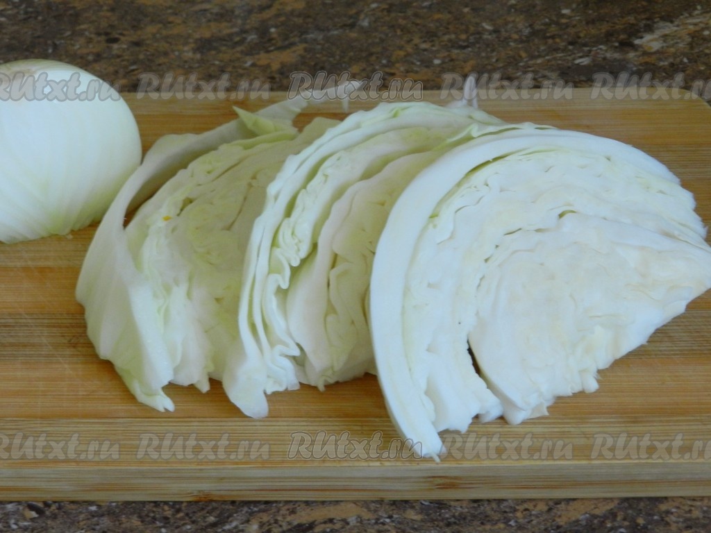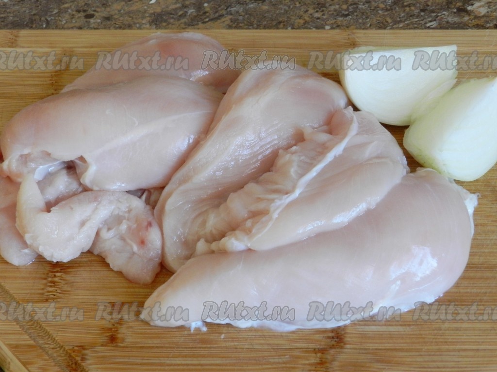Пропустить через мясорубку куриное филе с половиной луковицы и капустой.