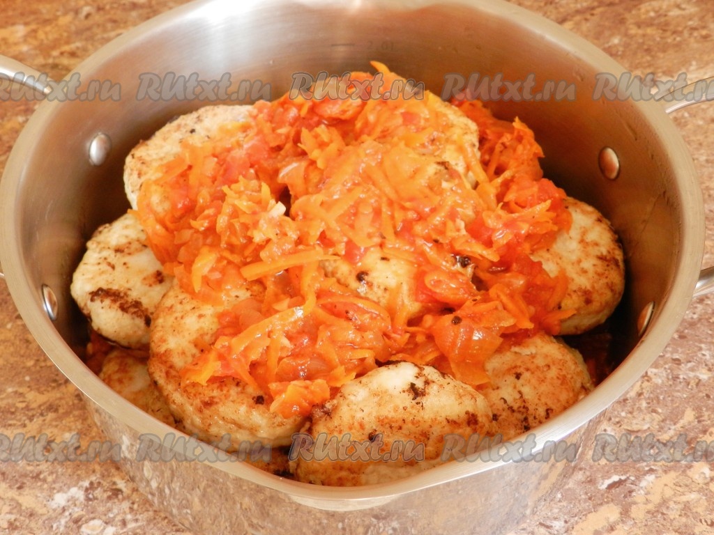 В кастрюлю с толстым дном выложить половину овощной заправки. На заправку выложить обжаренные ленивые голубцы.