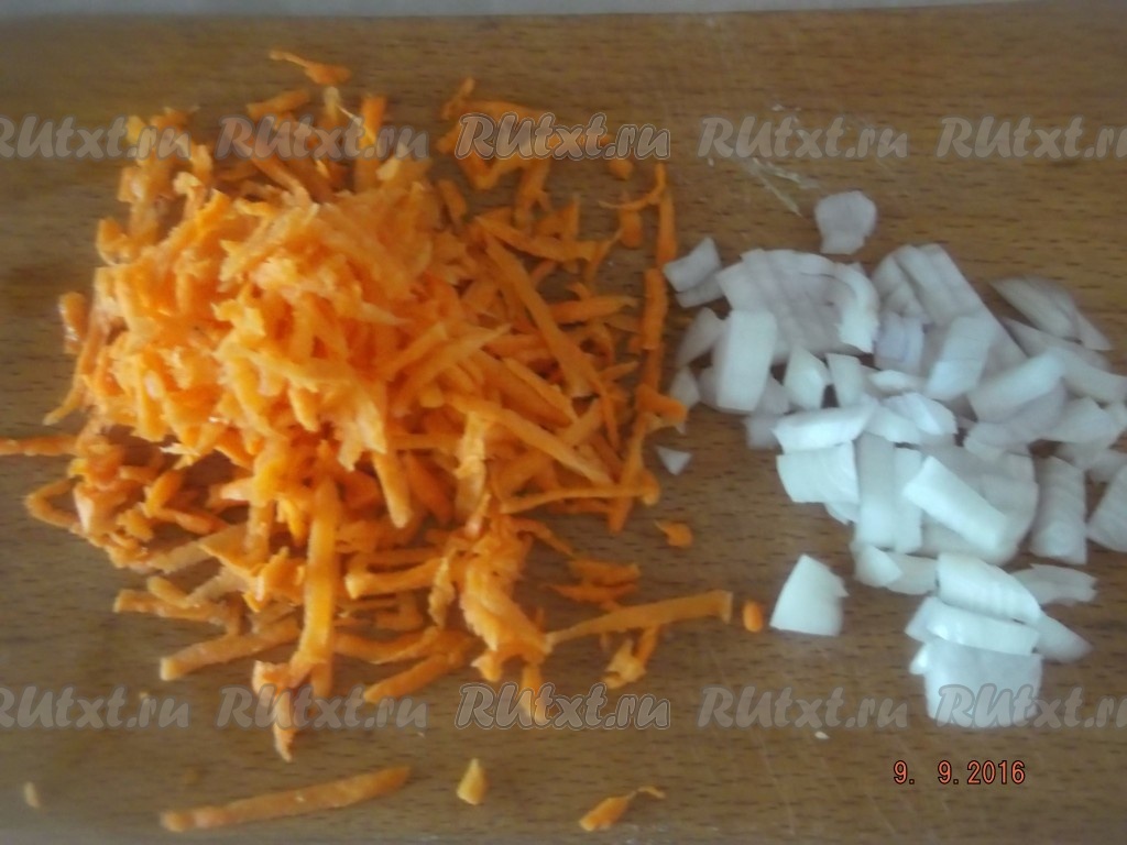 Обжариваем морковь и лук на сковороде с растительным маслом до золотистого цвета.