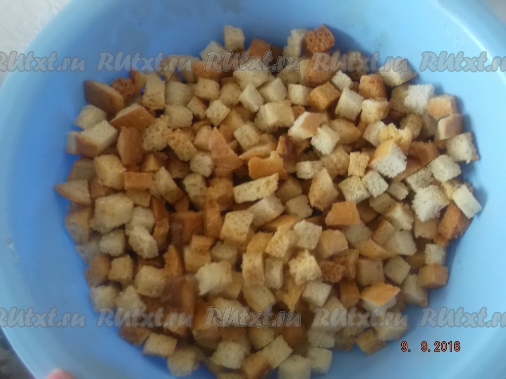 Когда картофель уже будет готов, добавляем обжаренные овощи, куркуму в кастрюлю, солим, перчим и варим гороховый суп еще 5 минут. Далее приступаем к приготовлению гренок. Берем хлеб и режем на небольшие кубики, примерно, 1х1 см и высыпаем на противень.
