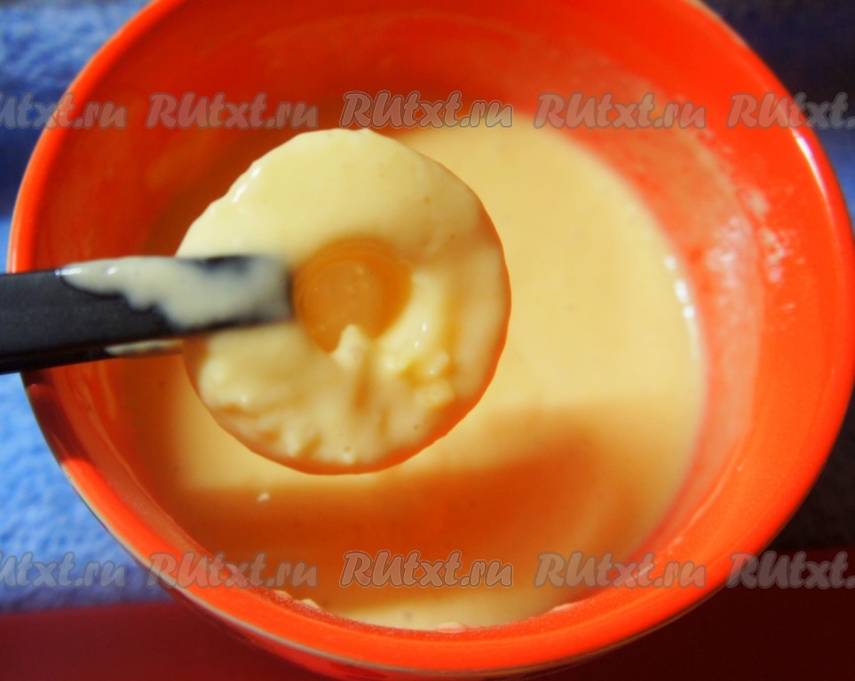 В сухие ингредиенты ввести жидкие, !но не наоборот. Тщательно перемешать. Кляр готов. Он должен быть консистенции густой сметаны.