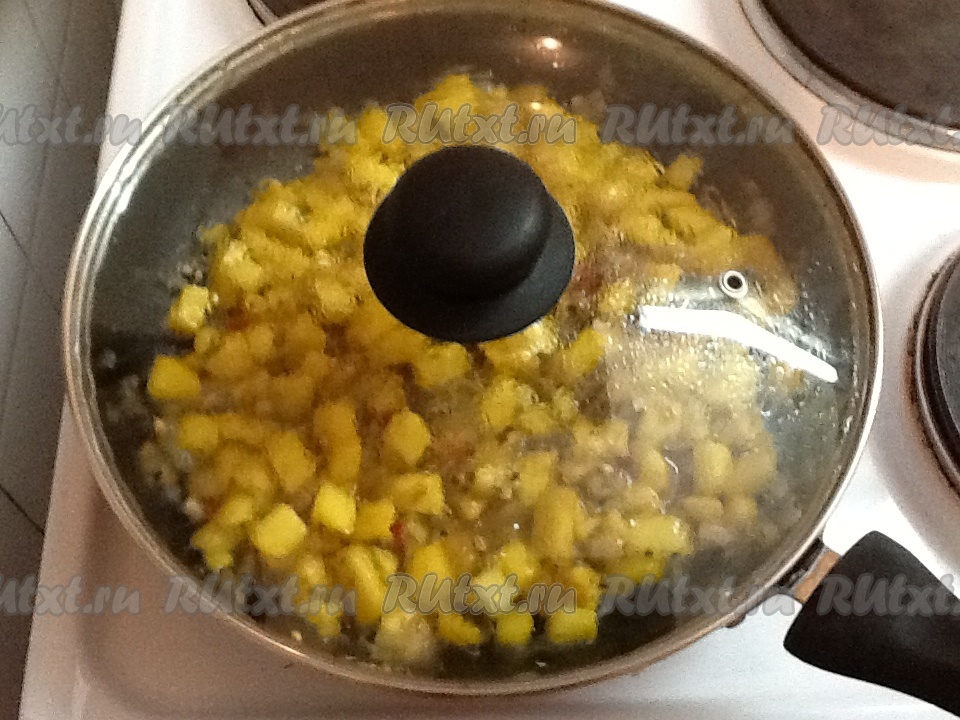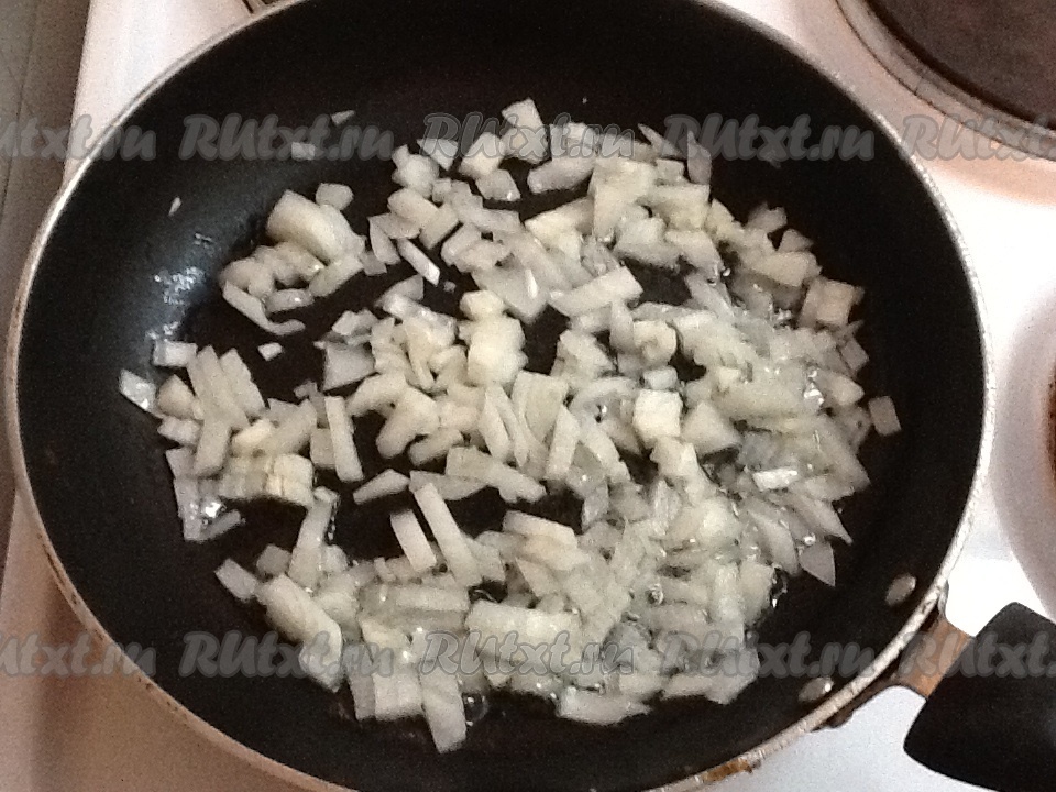Поставить сковородку на плиту, добавить пару столовых ложек растительного масла и разогреть. Выложить нарезанный лук и обжарить, иногда помешивая, в течение 3 минут.