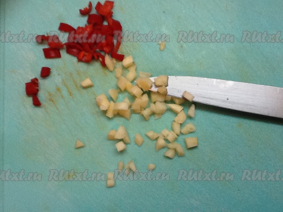 Очистить перчик чили от семян и нарезать на мелкие кусочки. Также мелко нарезать чеснок.