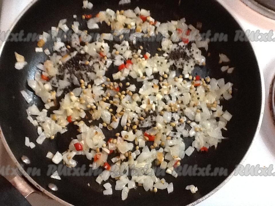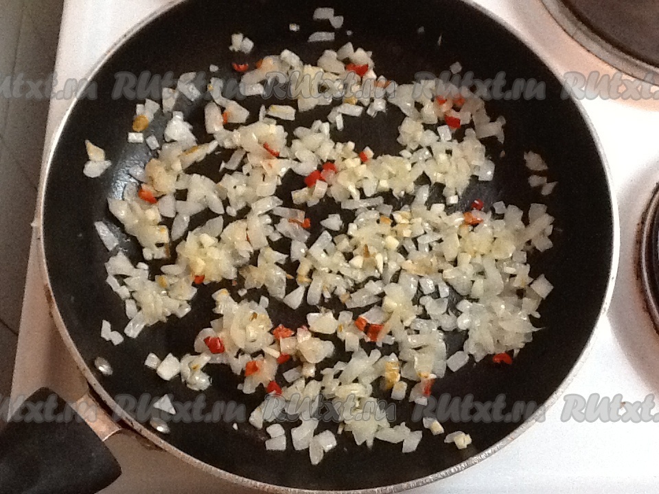 Добавить чили и чеснок к луку и обжаривать еще 2 минуты, пока лук не станет мягким, но не до коричневого цвета!