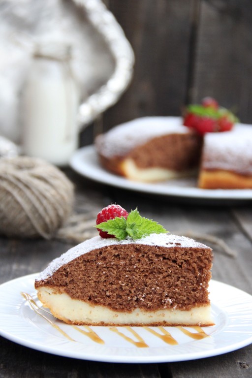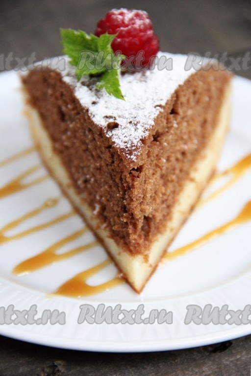 По желанию верх пирога можно присыпать сахарной пудрой. На фото видно, каким красивым получается творожно-шоколадный пирог в разрезе.
