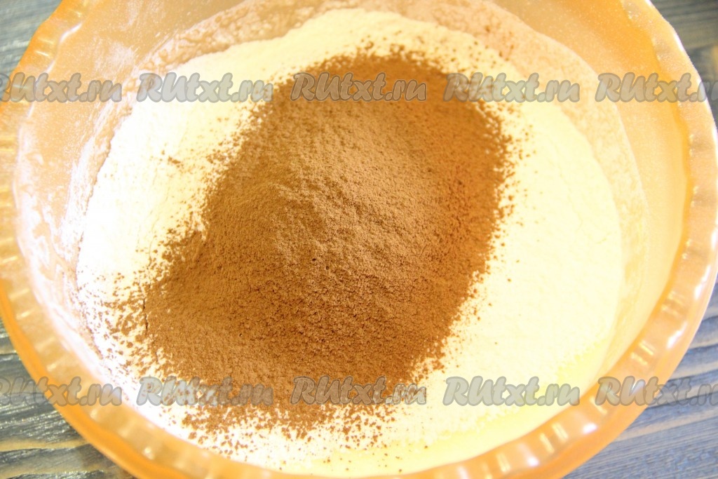 В получившуюся жидкую смесь всыпать просеянную муку, какао и разрыхлитель, перемешать с помощью силиконовой лопатки.