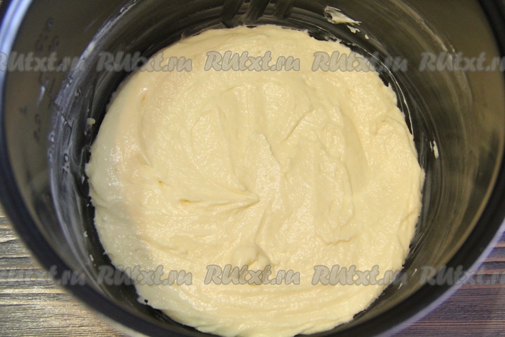 Чашу мультиварки смазать растительным или сливочным маслом. На дно чаши выложить творожную массу и аккуратно разровнять.