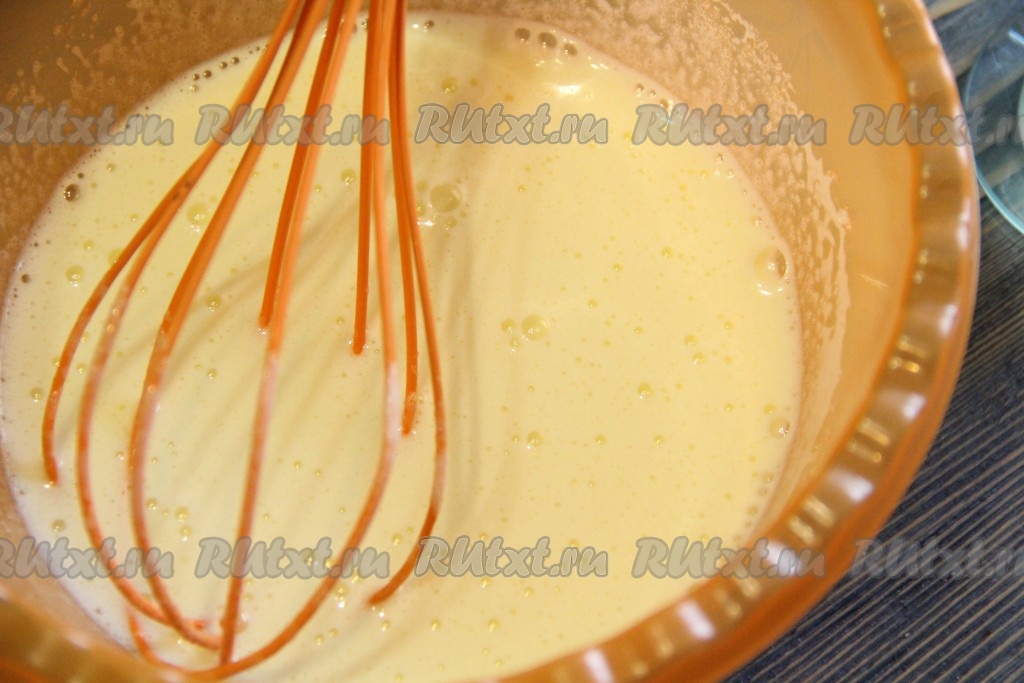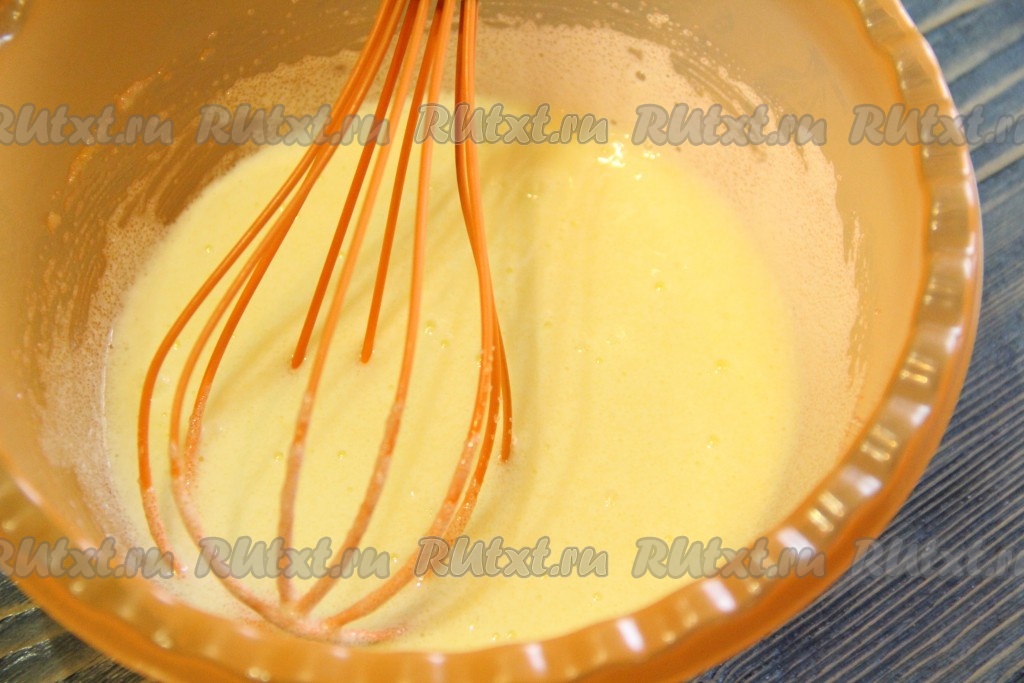 Яйцо с сахаром взбить до однородного и пышного состояния. Я взбила массу венчиком.
