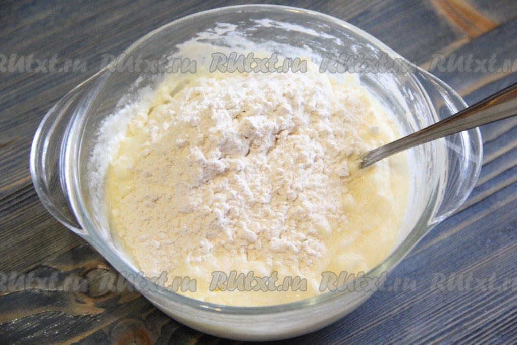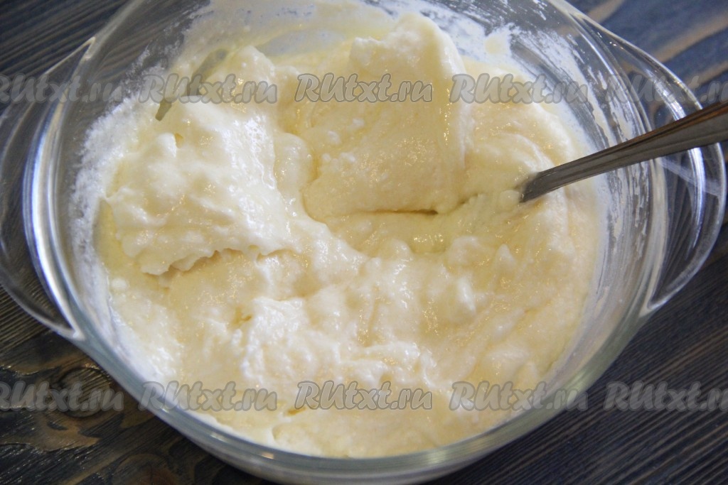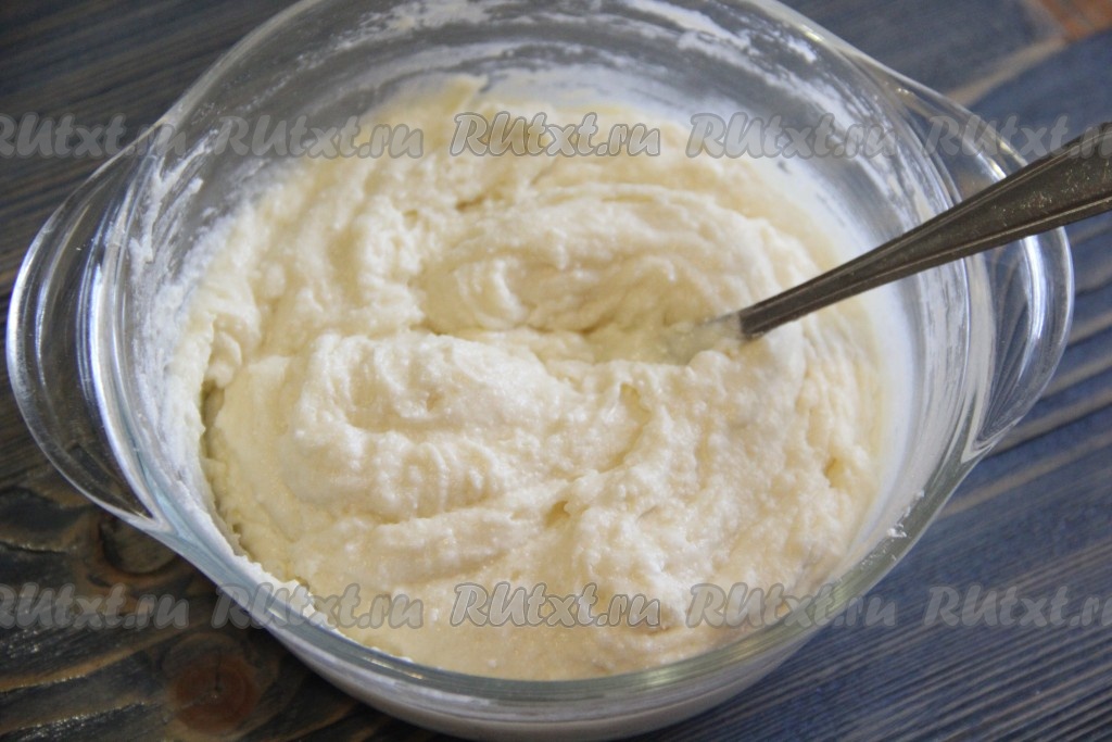 Тесто для творожного слоя получится не жидким и слегка комковатым.