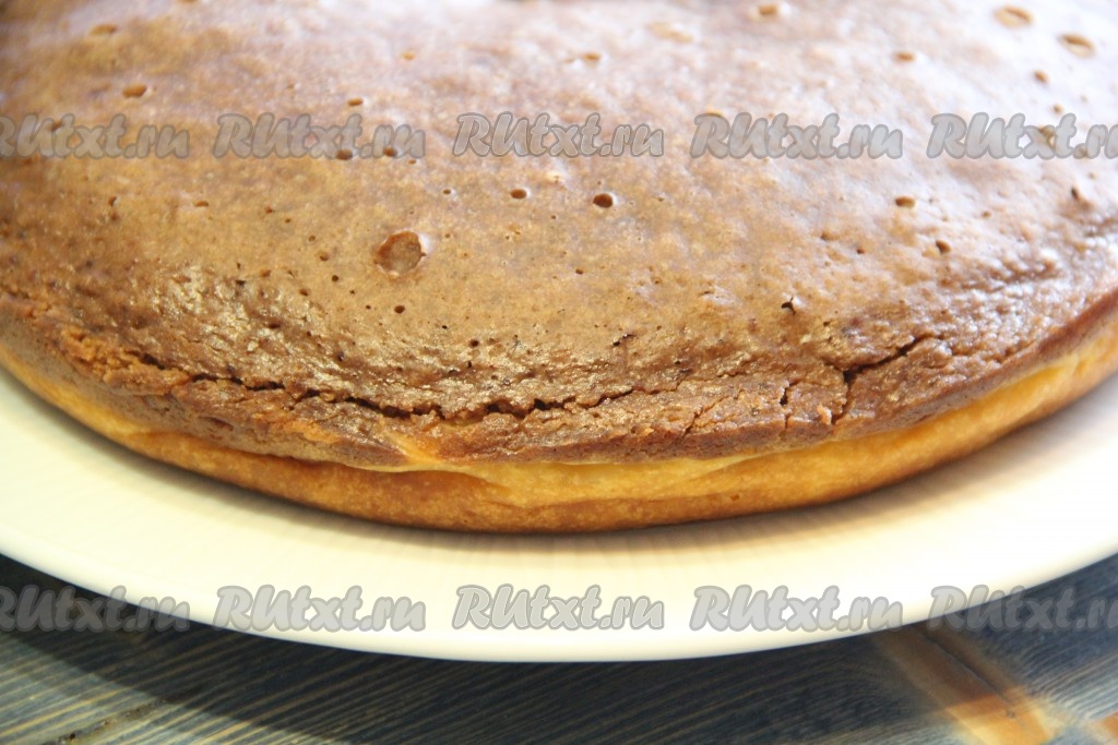 Готовность творожно-шоколадного пирога проверить сухой зубочисткой. Чашу мультиварки с готовым пирогом перевернуть на решётку, а затем - на плоскую тарелку так, чтобы творожный слой оказался внизу.