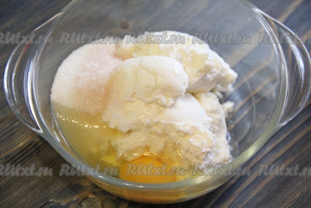 Соединить творог, яйцо, ванильный сахар и сахар.