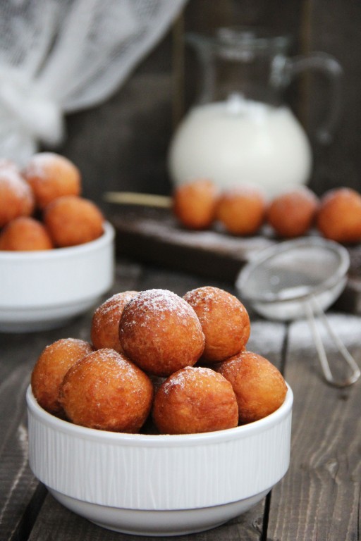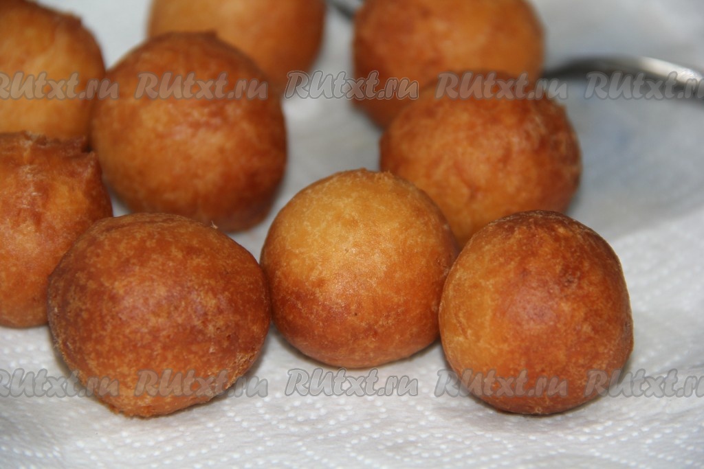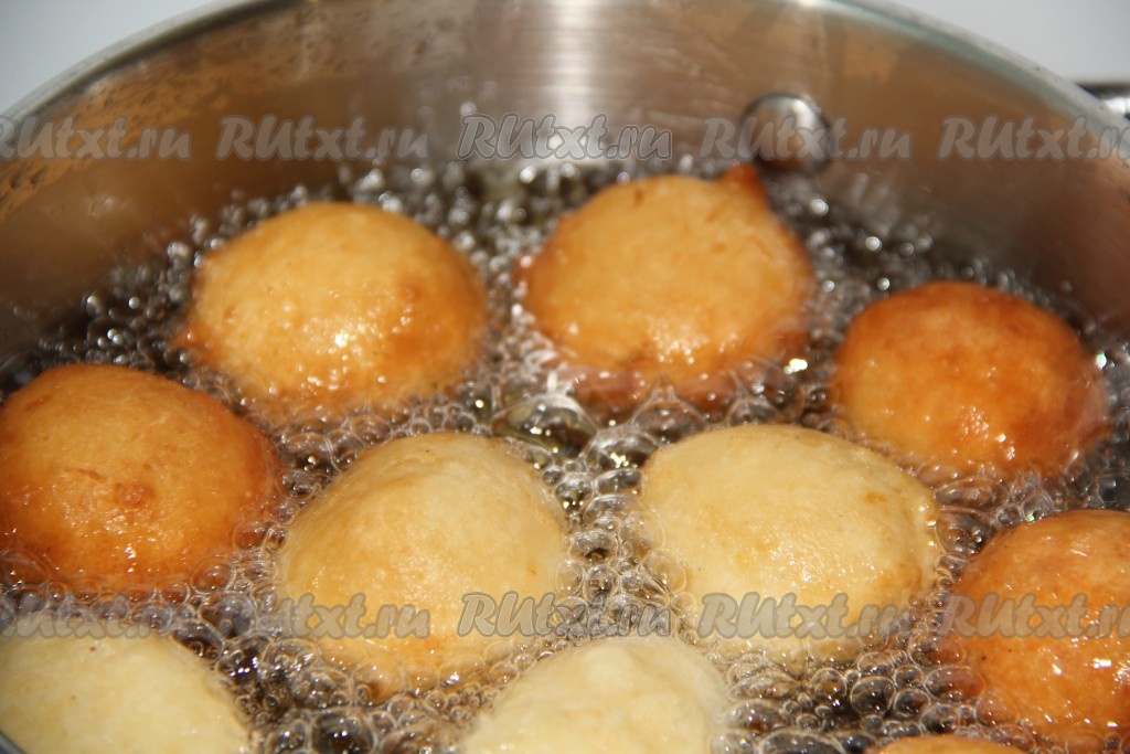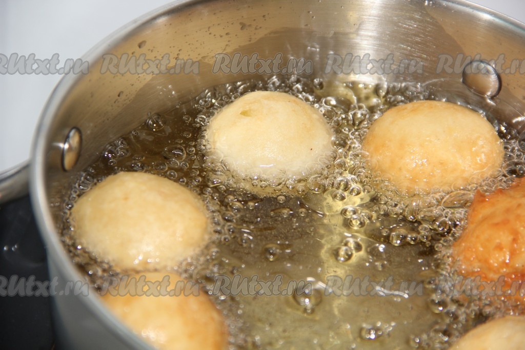 Растительное масло хорошо разогреть в высокой посуде. Пончики можно делать в виде шариков размером с грецкий орех, смочив руки в растительном масле. Или можно аккуратно выкладывать тесто в раскалённое масло чайной ложкой.