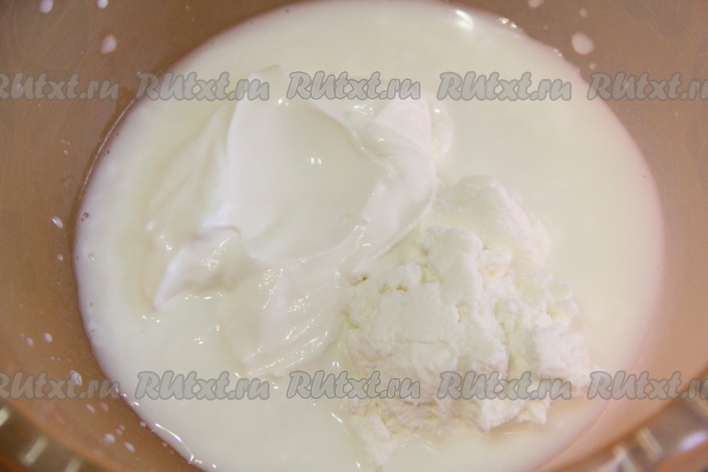 В глубокой миске соединить кефир, сметану и творог, тщательно перемешать.