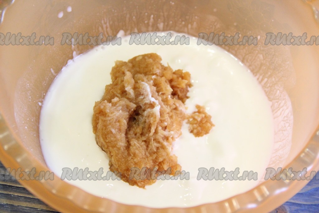 Добавить натёртое яблоко в творожно-сметанную массу и перемешать.