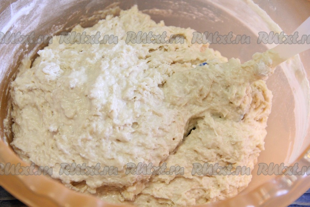 Затем понемногу всыпать оставшуюся муку, каждый раз тщательно вмешивая её, пока не получится достаточно густое тесто, липнущее к рукам. Размер яйца, жирность кефира, творога и сметаны могут быть разными, поэтому ориентируйтесь на густоту теста, а не на количество муки.