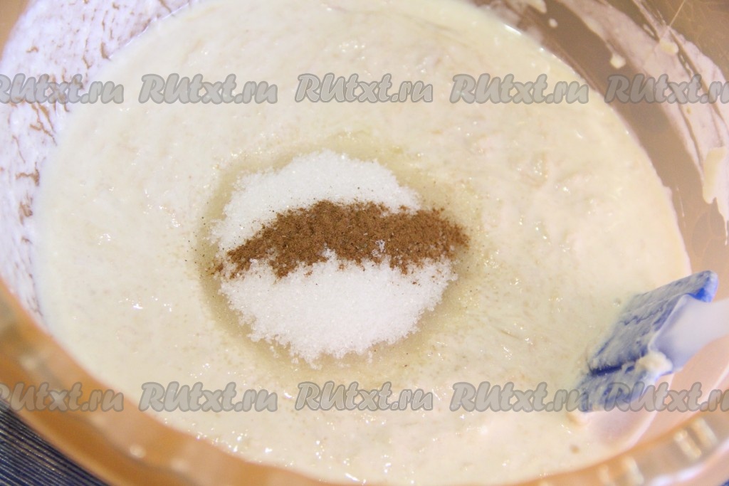 В получившуюся смесь всыпать соль, сахар и корицу, хорошо перемешать.