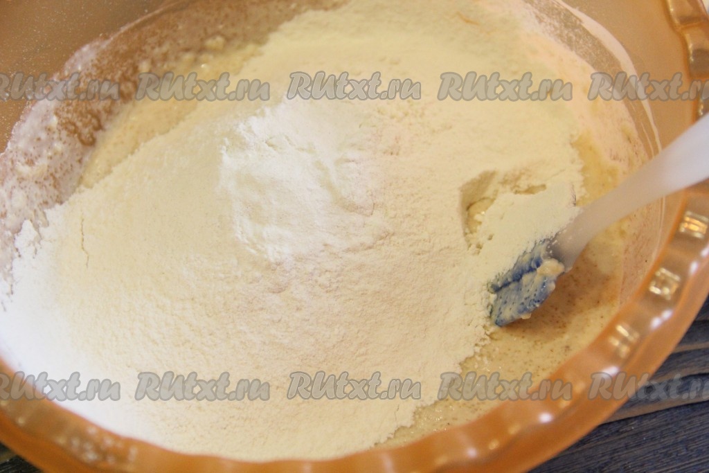 Далее добавить половину муки и разрыхлитель, тщательно перемешать.