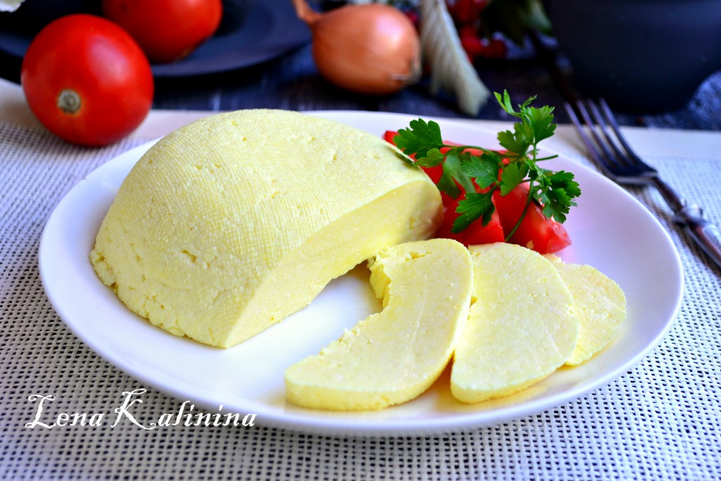 Вкуснейший, плотный, но нежный домашний сыр из молока и сметаны нарезать на ломти острым ножом и подать к столу.