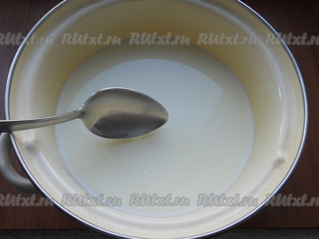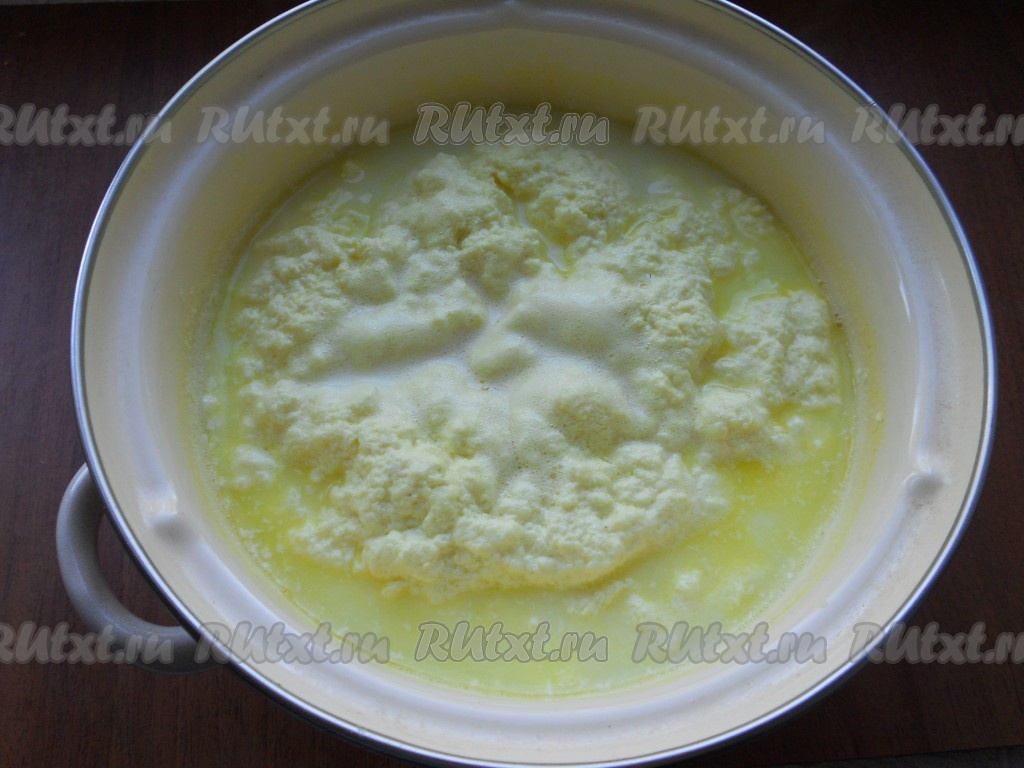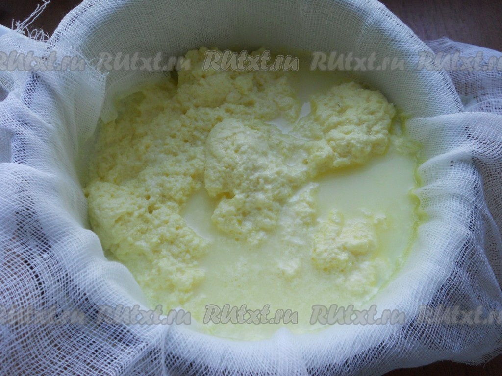 Отцедить через марлю, сложенную в 2-3 слоя, творог от сыворотки.